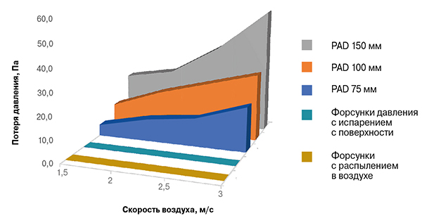 Системы с использованием форсунок не создают дополнительного сопротивления по воздуху, чего нельзя сказать о PAD-панелях (рис. 3). Как видно из графика, в системах с использованием PAD сопротивление потоку воздуха и связанный с ним рост энергопотребления тем больше, чем больше толщина и соответственно эффективность панели.