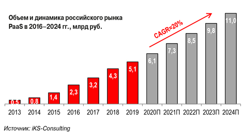 Несмотря на перечисленные трудности, развитие сегмента идет. Увеличивается число задач, стоящих перед бизнесом, растет и спрос на услуги PaaS. По оценкам iKS-Consulting, объем рынка PaaS в 2019 г. составил 5,1 млрд руб., в 2020-м он достигнет почти 6,1 млрд руб. и, увеличиваясь ежегодно на 20%, в 2024 г. вырастет до 11 млрд