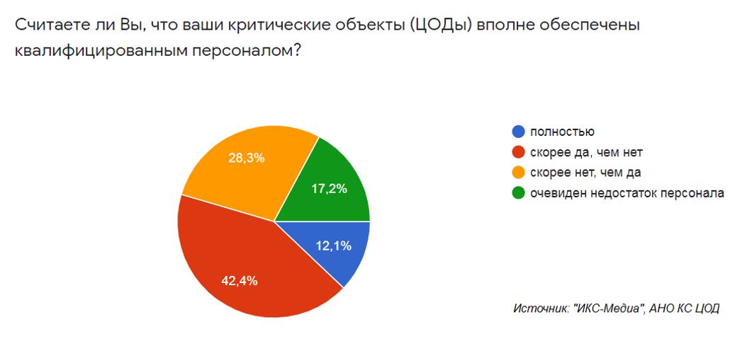 Более 85% респондентов выразили ту или иную степень неуверенности в том, что их критические объекты (ЦОДы) обеспечены квалифицированным персоналом, и только каждый восьмой доволен ситуацией в этой области.