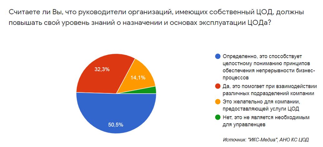 В целом ИТ – и ЦОДы как основные узлы цифровой инфраструктуры – оказывают все большее влияние на работу предприятий и организаций. Более того, пандемия высветила их критическую важность для бизнеса, госуправления, жизни и здоровья граждан. Поэтому, как следует из результатов опроса, не только специалисты, непосредственно занимающиеся проектированием, строительством и эксплуатацией ЦОДов, но и руководители компаний должны иметь хотя бы базовые знания о назначении и основах эксплуатации ЦОДа. Половина опрошенных считает, что это будет способствовать «целостному пониманию принципов обеспечения непрерывности бизнес-процессов», а еще треть – что это поможет взаимодействию различных подразделений компании.