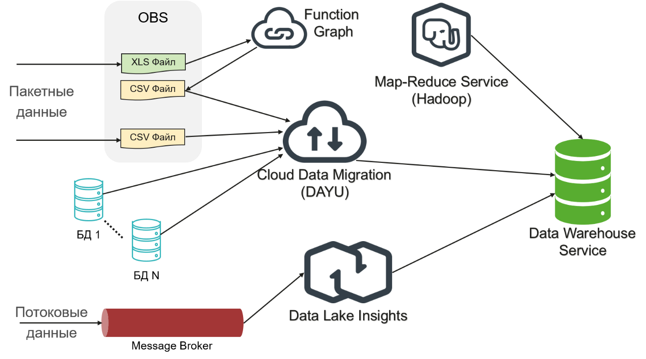 Конечной точкой является Data Warehouse Service, а в качестве центрального ETL-средства работает специализированный сервис Cloud Data Migration, входящий в пакет DAYU (Data-as-you-use). Этот сервис позволяет настроить перенос данных из любых источников, включая текстовые файлы и все виды реляционных и нереляционных СУБД. К сожалению, некоторые форматы файлов не поддерживаются напрямую, например, форматы электронных таблиц Excel, сформированных для человека. Прежде чем загрузить данные из такого файла, его требуется предварительно подготовить. В подобных случаях удобно воспользоваться сервисом бессерверных вычислений FunctionGraph, с помощью которого можно быстро написать и запустить код для базовой обработки/подготовки данных. А работа с данными, хранящимися в кластерах Hadoop, поддерживается «из коробки».