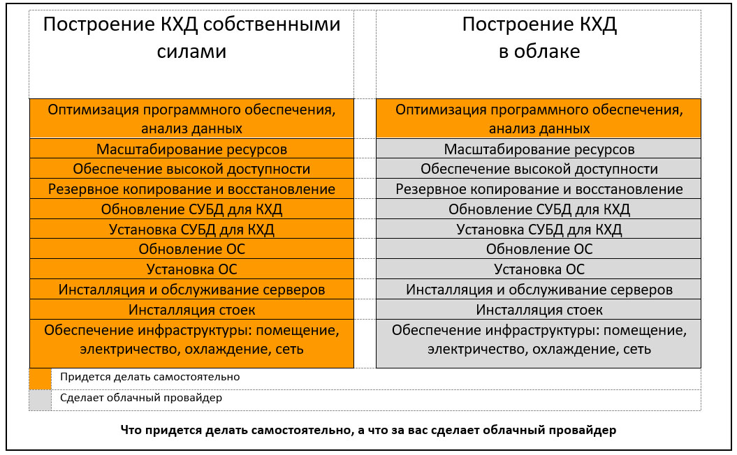 И все же выход есть! Задача существенно упрощается, если строить КХД в облаке. Конечно, облачный провайдер не сделает за заказчика подготовку и анализ данных, но вот в чем он точно может помочь, так это в предоставлении инфраструктуры и готовых сервисов для построения КХД. Действительно, в облаке можно получить:
