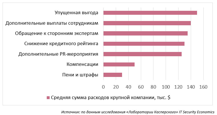Потери организаций вследствие реализации рисков ИБ включают в себя как прямые потери, так и последующие траты. По данным глобального исследования «Лаборатории Касперского» IT Security Economics, в 2020 году прямые потери от инцидента, связанного с утечкой данных, составили в среднем по миру $745 тыс.