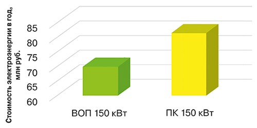 Рис. 4. Затраты на электроэнергию в ЦОДе с ПК и ВОП