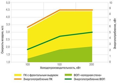 На рис. 2 показана зависимость скорости потока воздуха и энергопотребления для ПК с фронтальным выдувом и ВОПа «холодная стена». Скорость воздуха при прохождении через ВОП минимум в два раза меньше, чем при прохождении через блок ПК, при одинаковой площади, занимаемой этими устройствами. Это объясняется прежде всего конструкцией теплообменного блока. Дело в том, что сечение блока ПК, через который проходит воздух, заведомо меньше, чем сечение блока ВОПа с аналогичной площадью размещения.