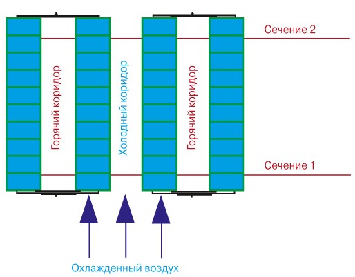 Разберем разницу между ВОПами и ПК с фронтальным распределением воздуха на примере небольшого сегмента машинного зала (рис. 1). Рассмотрим два модуля стоек с изолированными горячими коридорами и условимся, что для сечения 1 все параметры будут помечены индексом 1, а для сечения 2 – индексом 2 соответственно.