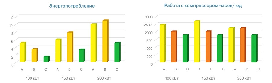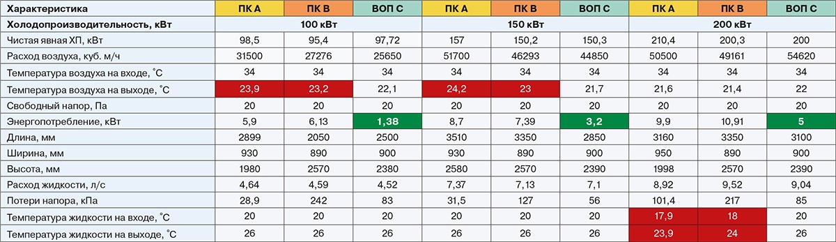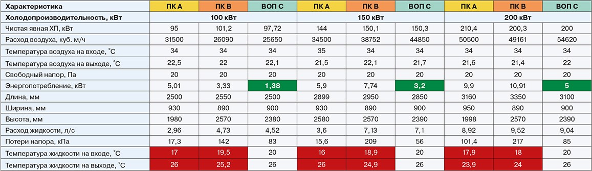 Проверим нашу теорию на практике, используя вышеприведенные исходные данные для сравнения ПК с фронтальным выдувом и ВОПа типа «холодная стена» при условии, что ВОП и ПК с равной производительностью занимают одинаковую площадь. Для сравнения выберем аппараты производительностью 100, 150 и 200 кВт.