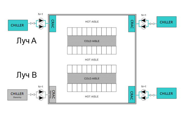 В таком решении применяются небольшие чиллеры со спиральными компрессорами. Такой чиллер существенно дешевле (за кВт холода) больших систем, а небольшая мощность (120—150 кВт) делает более простой и дешевой обвязку (трубы, кабели, арматура, баки и т.д.). Небольшие вес и габариты упрощают доставку такого оборудования и его монтаж. Эксперт Vertiv также отмечает малый шаг наращивания мощности, что позволяет легко адаптироваться к неполной загрузке ЦОДа. Наконец, при использовании подобных решений проще обеспечить отсутствие единой точки отказа, что важно, например, для набирающих популярность ЦОДов Tier IV.
