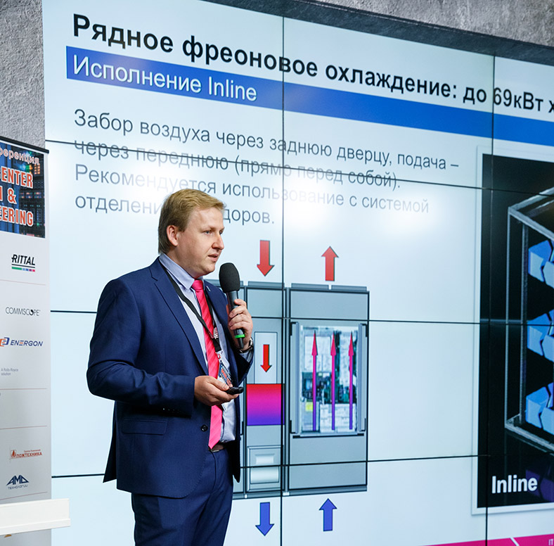 Компания Rittal, занимающаяся производством промышленных кондиционеров с 1988 года, сегодня имеет в своем арсенале весь спектр систем охлаждения (как своей разработки, так и полученных благодаря сотрудничеству с Stulz). Но на DCDE-2021 она акцентировала внимание специалистов именно на своих внутрирядных фреоновых кондиционерах. Модель LCP DX шириной 300 мм может обеспечить холодильную мощность до 25 кВт, что позволяет «снять» до 23 кВт тепла со стойки – очень высокий показатель. Для ряда российских регионов может оказаться важным наличие специального исполнения этого кондиционера (разработано совместно с Stuz) для эксплуатации при температурах наружного воздуха до -60°С. Кроме того, производитель может поставлять такие кондиционеры под разную высоту серверных стоек, в том числе 47U и 52U.