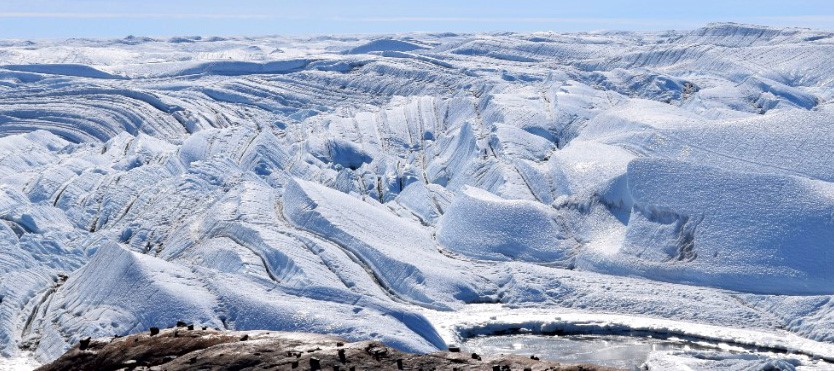 Летом лед «скатывается» с ледникового щита и, врезаясь в шельфовый лед, переворачивает соседние льдины, образуя сложную поверхность шельфового ледника