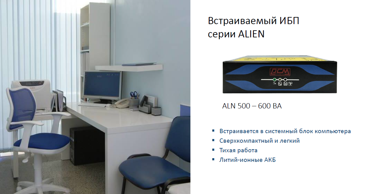 Для создания компактных рабочих мест можно использовать встраиваемый в системный блок компьютера ИБП ALIEN. Применение литий-ионных АКБ позволило сделать это устройство сверхкомпактным и легким. Такое решение значительно уменьшает место, занимаемое оборудованием. Оно идеально подойдет, например, для передвижных лабораторий или небольших кабинетов.