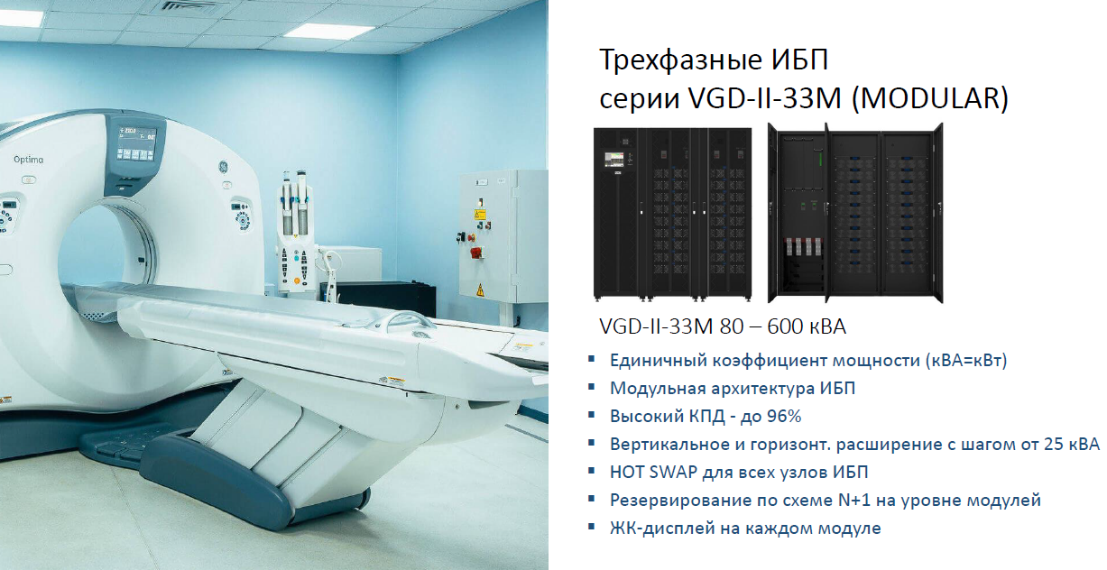 Томографы размещаются обособленно от другого оборудования. Во-первых, это зачастую очень мощные аппараты (от 60 до 180 кВт), установка которых требует отдельного помещения. Во-вторых, их работа без защиты питания опасна для исследуемых пациентов. В-третьих, стоимость томографов высока, а риск повреждения при некачественном питании велик. Для их защиты обычно используют трехфазные онлайн-ИБП большой мощности.