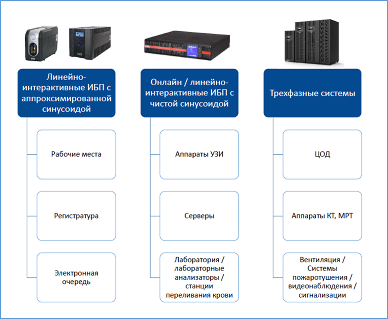 Все эти процессы прямо или косвенно повлияли на спрос медучреждений на источники бесперебойного питания (ИБП). Рассмотрим специфику выбора ИБП для различных систем (узлов) медицинского учреждения.