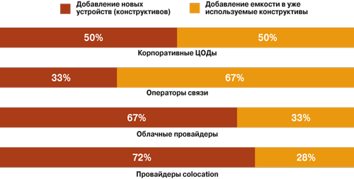 Опрошенные операторы облачных и colocation-ЦОДов предпочтут масштабировать систему за счет установки новых устройств, в то время как большинство операторов связи намерены увеличить емкость уже имеющихся ИБП (рис. 2).