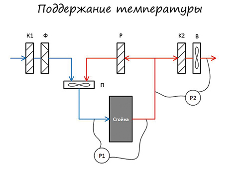 На рисунке видно, что входящий воздух проходит через приточный клапан К1 и фильтровальную стену Ф, поступает на приточные вентиляторы П, проходит через серверную стойку, где нагревается и либо поступает сразу на вытяжные клапаны К2 и вентиляторы в теплое время года, либо через рециркуляционные клапаны Р смешивается с приточным холодным воздухом для поддержания комфортной температуры.