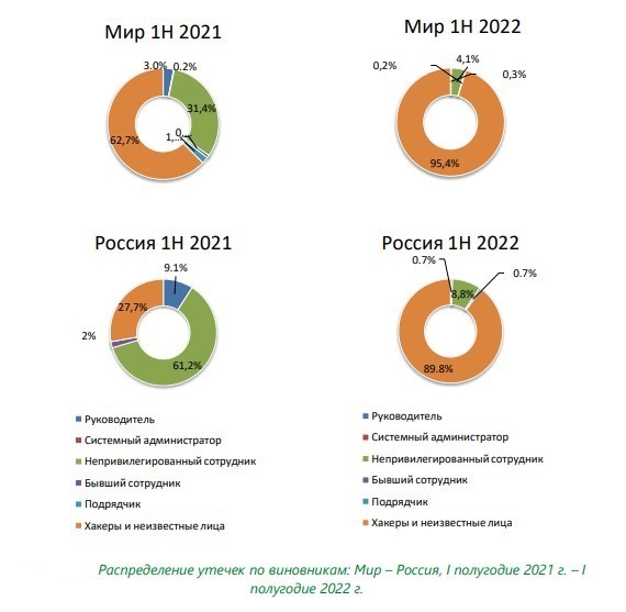 Впрочем, и зарубежные компании не любят выносить сор из избы. Не скрывая факт утечки, они нередко не проводят объективного расследования, а идут по наиболее простому пути – обвиняют «русских хакеров» и прочих внешних нарушителей. На них и в прошлом году списывали 67,7% утечек, а в этом году цифра достигла 95,4%. Почти втрое увеличилась среди виновников доля хакеров и неизвестных лиц у российских компаний, но это хотя бы можно объяснить специальной военной операцией на Украине и резко возросшим количеством атак на наши ресурсы.