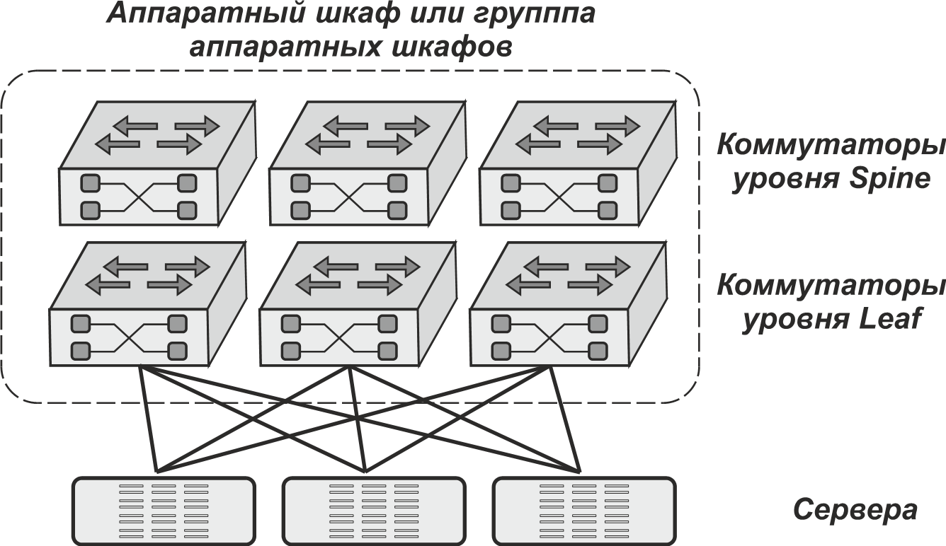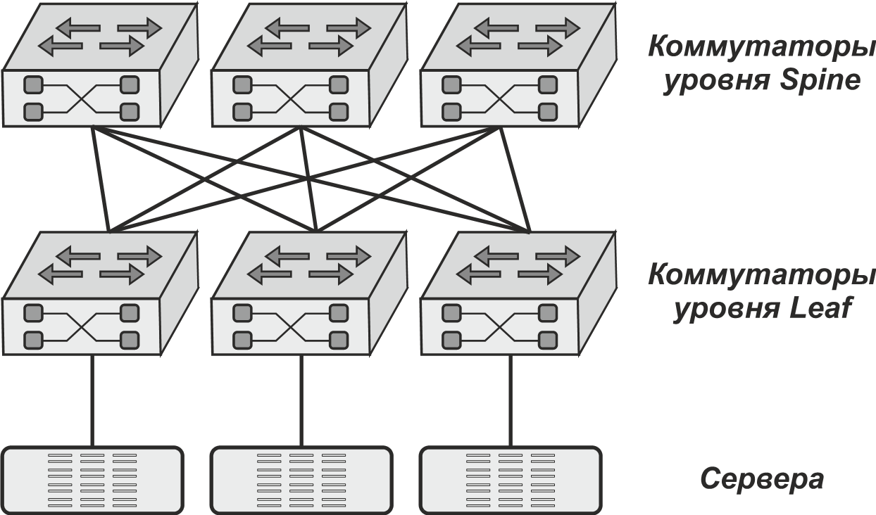 Двухуровневая архитектура, называемая также децентрализованной ячеистой (mesh) архитектурой, обладает рядом достоинств, благодаря чему она получила широкое распространение и даже специальное наименование – Spine – Leaf. Ее идея предельно проста: в этой архитектуре каждый коммутатор нижнего уровня (Leaf) соединен выделенной неблокируемой связью с каждым коммутатором верхнего уровня (Spine). Основное достоинство архитектуры Spine – Leaf заключается в том, что при обмене данными между двумя произвольно взятыми серверами трафик проходит только через один коммутатор верхнего уровня Spine и задержка сигнала становится предсказуемой и согласованной.