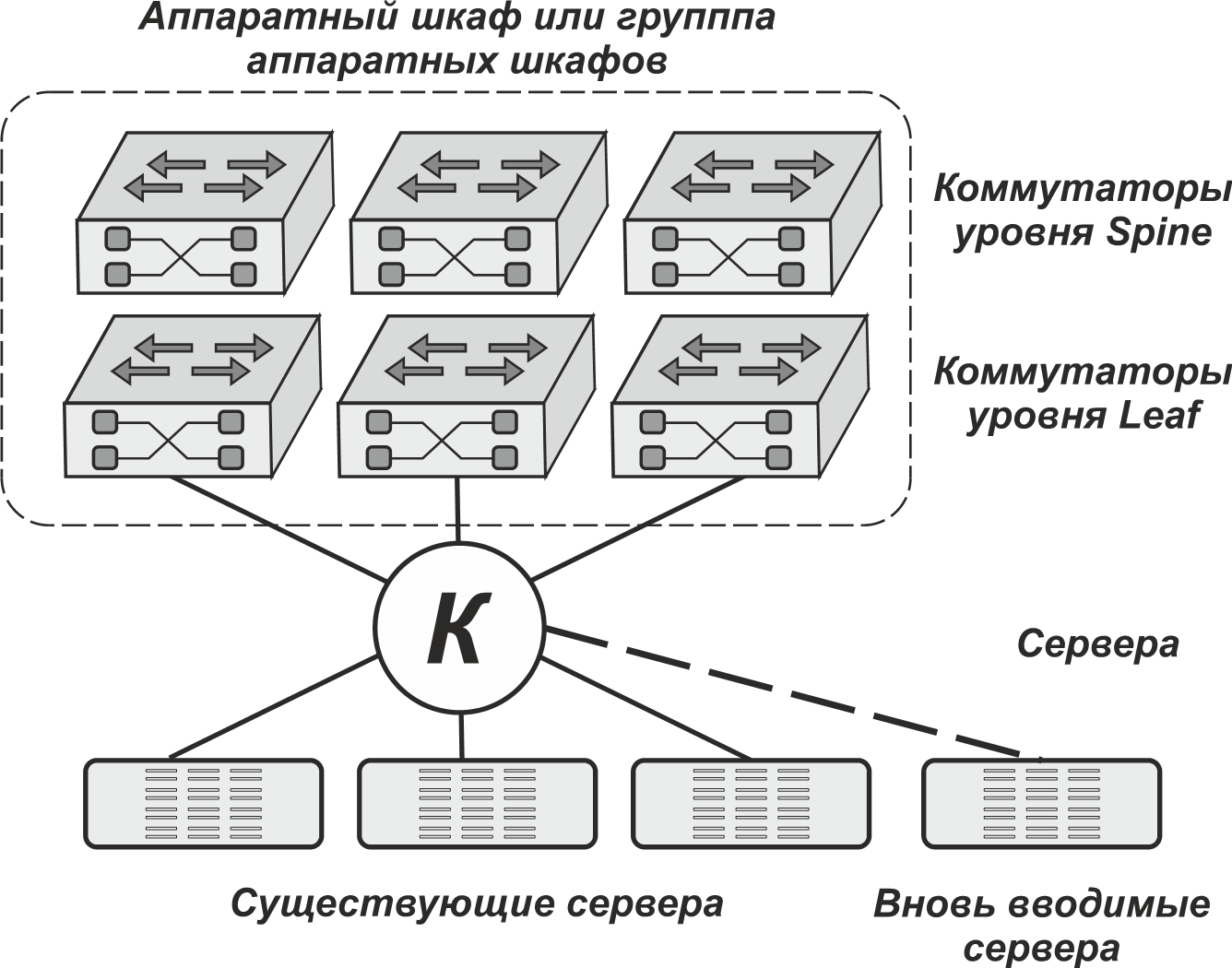 Рис. 4. Построение нижнего уровня ЛВС машзала при реализации архитектуры Spine-Leaf с дополнительным главным кроссом (К)