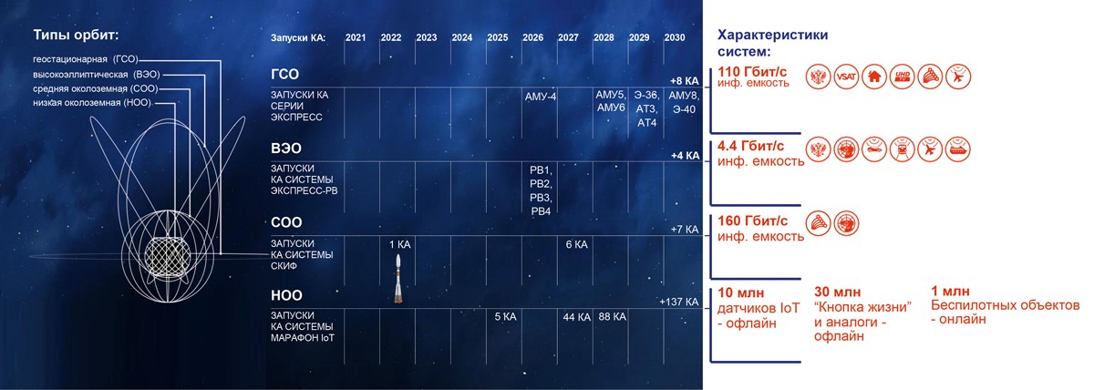 В 2022–2030 гг. предполагается запустить на орбиты до 156 новых спутников гражданского назначения для глобальной связи, вещания, ШПД и IoT. В результате к 2030 г. общая информационная емкость российской спутниковой инфраструктуры связи и вещания составит 274 Гбит/с. Эта инфраструктура должна обеспечить решение всех перспективных задач РФ до 2045–2050 гг.