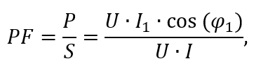 Поскольку ИБП содержит нелинейные полупроводниковые элементы, сопротивление которых зависит от напряжения и тока в их цепи, при подключении его к электрической сети генерируются дополнительные гармонические составляющие тока и напряжения: ток и напряжение на входе ИБП перестают быть строго синусоидальными. Коэффициент мощности PF при этом равен:
