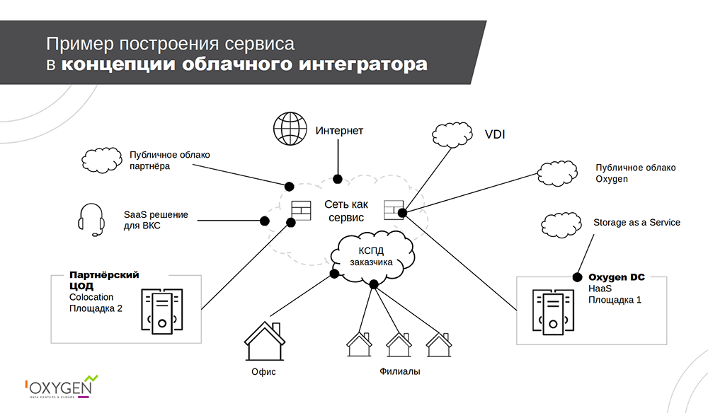 Компания Oxygen использует второй подход и выступает в роли облачного интегратора (рис. 1). Она несет дополнительные затраты на обеспечение связности с поставщиками услуг, но зато предоставляет максимально гибкое архитектурное решение, многообразие услуг, позволяющее каждому заказчику выбрать для себя оптимальный по стоимости и функционалу сервис. Кроме того, с помощью общего домена VPLS (Virtual Private LAN Service) компания обеспечивает сетевую связность между офисами и ЦОДом клиента.