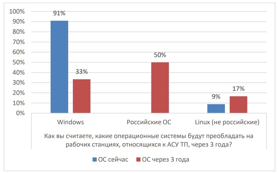 Специалисты по АСУ ТП скептически относятся к импортозамещению ОС в их сфере — половина опрошенных компанией InfoWatch считает, что даже через три года переход на российские ОС для них неосуществим.