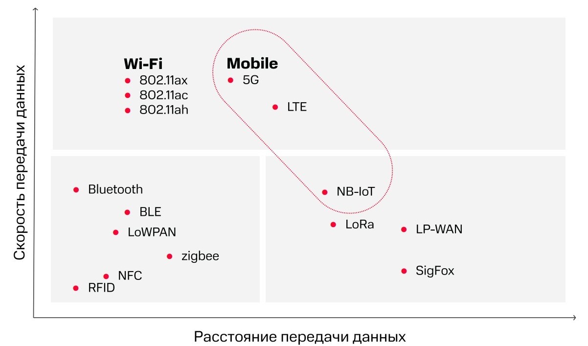 Технология LTE оптимальна и по соотношению скорости передачи данных и расстояния (рис. 2). Кроме того, она обеспечивает низкую задержку сигнала. Если для сетей Wi-Fi задержка составляет сотни миллисекунд (до 500 мс), то для LTE – десятки, а для 5G – единицы. Это может быть критичным на конвейере или при управлении автономным грузовиком в карьере. Сети LTE допускают более гибкое частотное планирование и способны обслуживать большее количество пользователей в зоне покрытия одной базовой станции с необходимым уровнем качества. Например, предоставлять нормальную мобильную связь болельщикам на крупных стадионах.