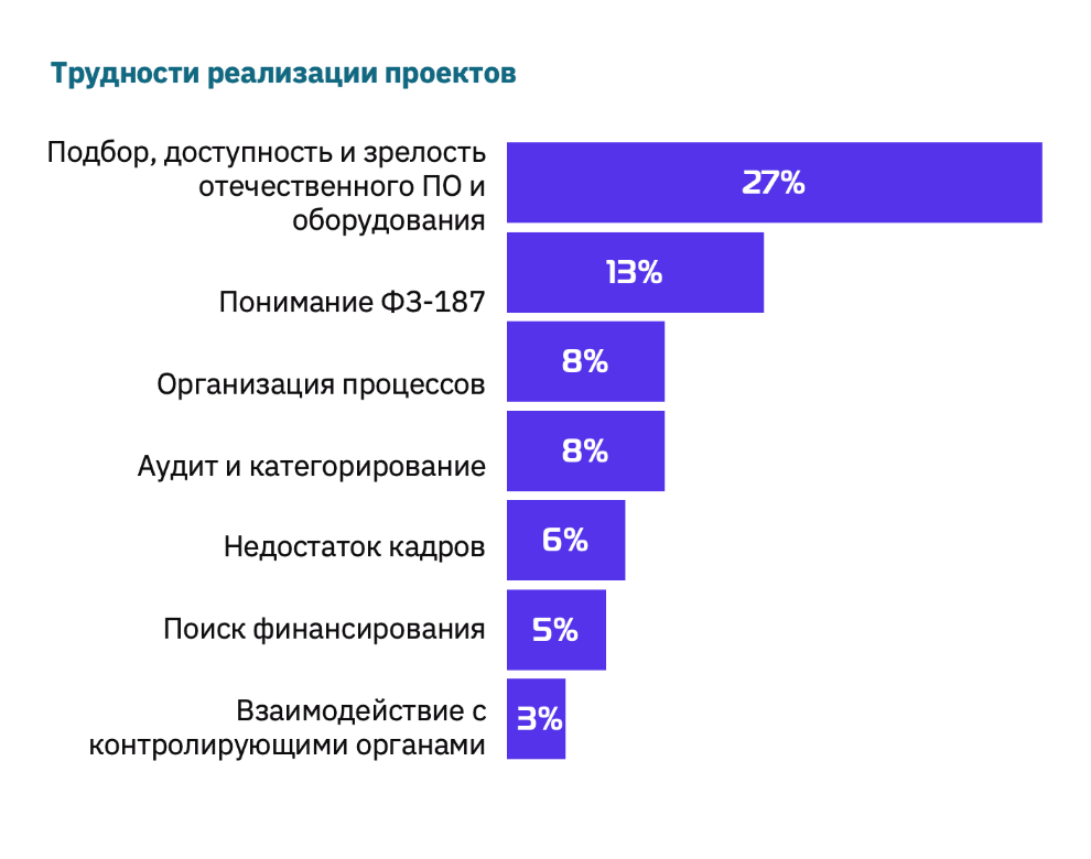 К категории субъектов КИИ относятся предприятия, нарушение работы которых может привести к выходу из строя транспортной инфраструктуры, сетей связи, государственных услуг, нанесению ущерба жизни и здоровью людей. Основная цель 187-ФЗ — защитить IT-системы госорганов, банков, промышленности, медицинских учреждений и других компаний от кибератак. Хотя закон был принят в 2018 году, 35% респондентов ещё находятся на старте реализации проекта. Только 7% компаний полностью завершили его.