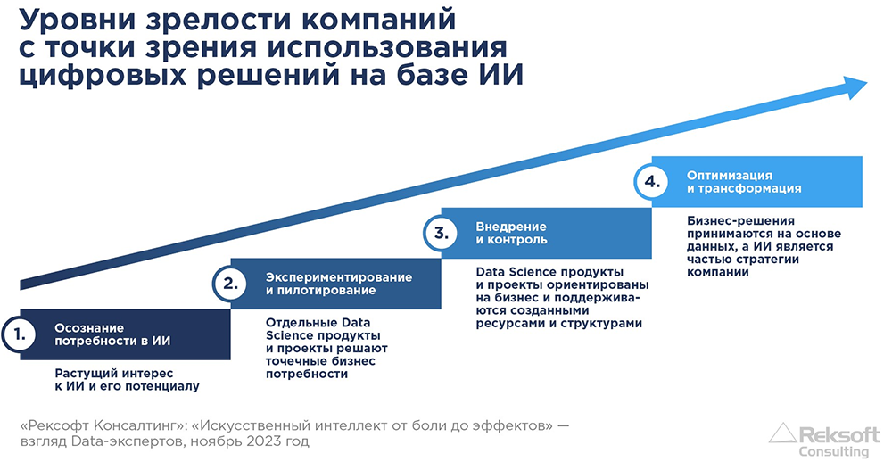 Подводя итоги исследования, Алексей Богомолов, директор практики «Стратегия трансформации» «Рексофт Консалтинг» сказал: «ИИ часто воспринимается как «модная игрушка», при этом упускается самое главное – ИИ должен давать компании системный трансформационный эффект. Необходимо создание технологической и организационной базы для системного развития цифровых продуктов от прототипирования до получения эффекта. Здесь стоит задуматься над созданием «цифрового конвейера» в купе с бизнес-трансформацией самой компании. В результате ИИ должен стать понятной и привычной технологией для бизнеса – повседневным рабочим инструментом, интегрированным в текущие бизнес-системы такие как ERP м CRM-системы и аналитику».