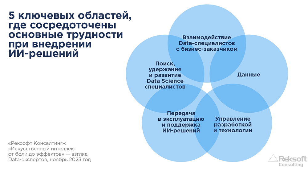 По результатам интервью были выделены пять ключевых областей, в которых сосредоточены основные трудности, не позволяющие эффективно внедрять ИИ-решения в российских компаниях: