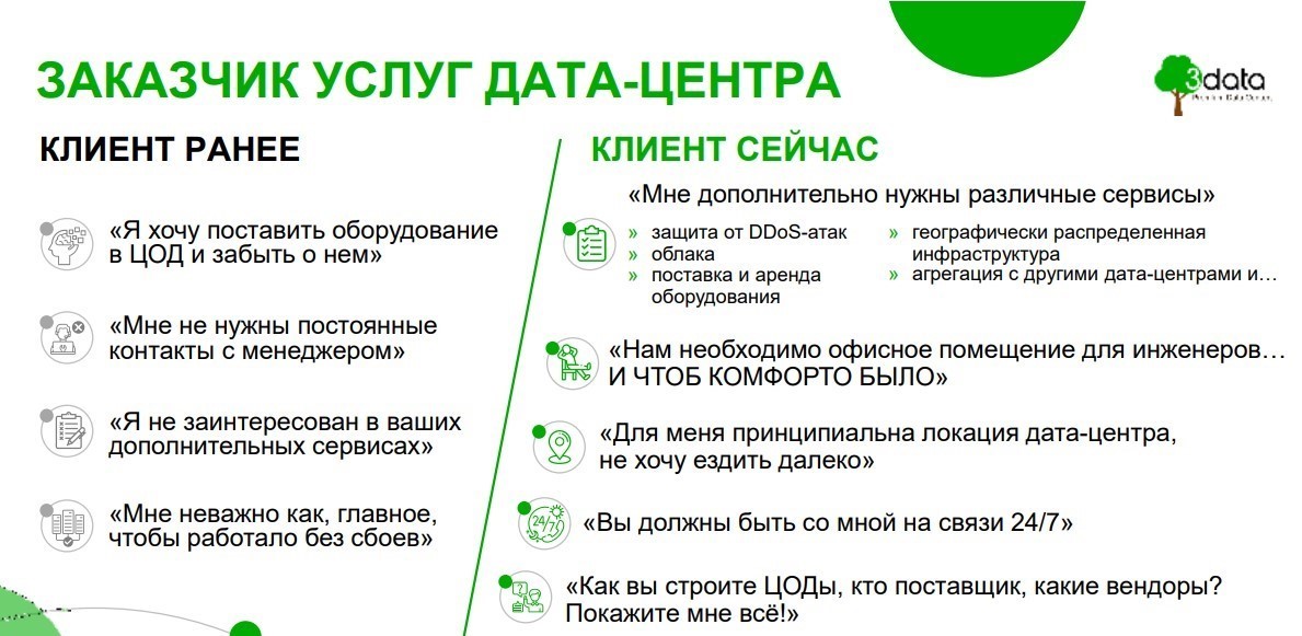 При этом требования к комфорту, к предоставляемому дата-центром оборудованию, к связи и возможности агрегации с другими дата-центрами подразумеваются сами собой. Заказчики стали интересоваться техническими деталями: какое используется оборудование, насколько надежны вендоры, как обеспечивается безопасность. Кроме того, случаются форс-мажорные ситуации, когда счет идет на минуты, и менеджер дата-центра должен быть на связи круглосуточно.