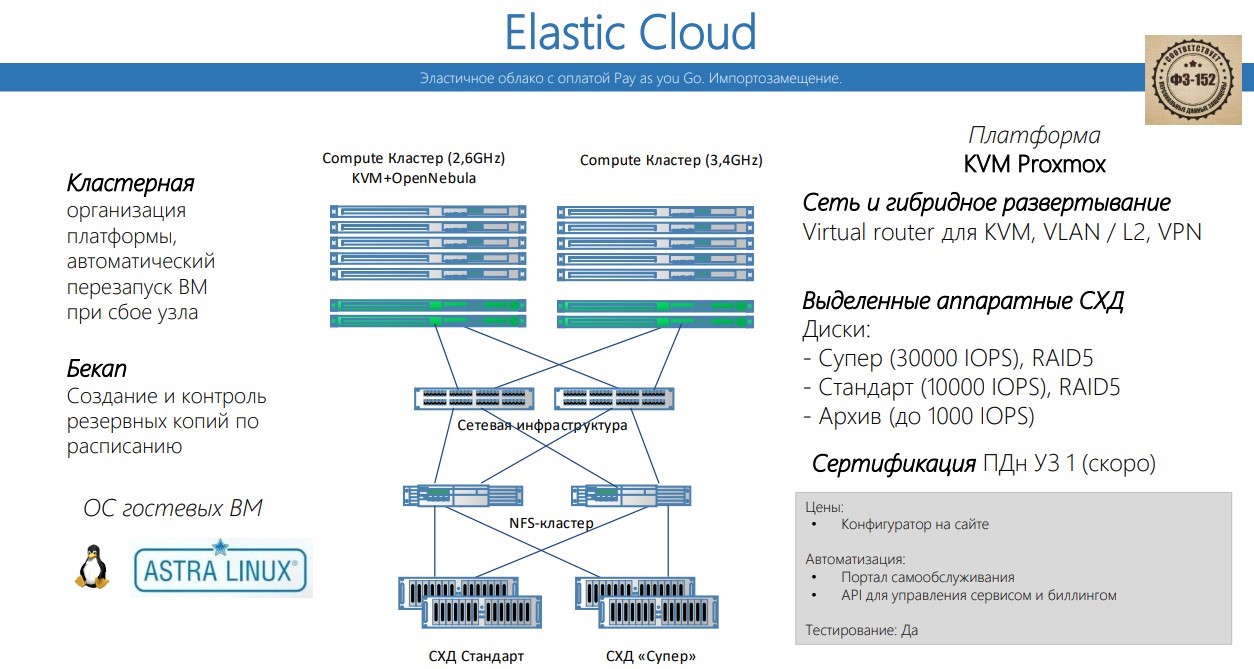 Вариантов несколько. Если импортозамещение нужно – можно взять облачную платформу Elastic Cloud на базе open source (KVM и OpenNebula), если нет – на базе Hyper-V. Биллинг поминутный, оплачиваются только используемые ресурсы. В рамках сервиса Application pool (Hyper-V) можно оплачивать пул ресурсов, что удобно, когда клиент разворачивает инфраструктуру самостоятельно.