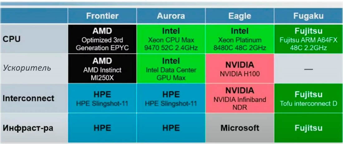 В 2023 г. всю призовую тройку заняли американские суперкомпьютеры. Первую строчку с 2022 г. с производительностью 1,19 экзафлопс (пиковая – 1,69 Eflops) удерживает развернутый в Национальной лаборатории Оук-Ридж (ORNL) в Теннеси суперкомпьютер Frontier. Экзафлопсный суперкомпьютер – лучшее изобретение человечества 2023 г., по версии американского журнала Time, – основан на новейшей архитектуре HPE Cray EX235a и оснащен процессорами AMD EPYC 64C с частотой 2 ГГц. Общее количество ядер системы – 8 699 904, показатель энергоэффективности – 52,59 гигафлопс/Вт, а для передачи данных используется сеть (интерконнект) HPE Slingshot 11 (совместная разработка HPE и Cray). Мощность установки – как у крупного ЦОДа – 22,7 МВт.