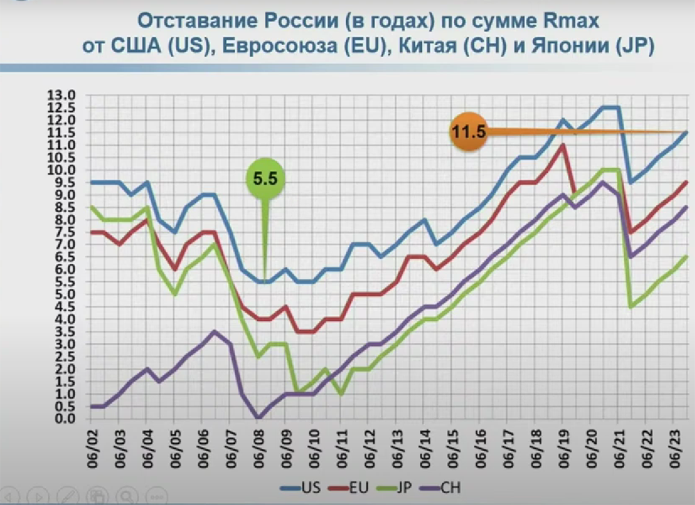 В 2008 г. отставание России по совокупной вычислительной мощности суперкомпьютеров из Top500 (Rmax) составляло 5,5 лет, а по уровню развития технологий – всего 2,5 года. В 2022 г. новых суперкомпьютеров в стране не появилось, отставание по Rmax от лидеров увеличилось и достигло 11,5 лет.