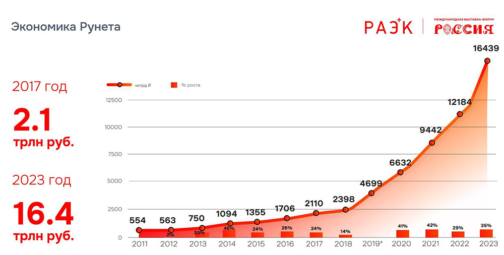 В целом экономика Рунета выросла почти в восемь раз, с 2,1 трлн руб. в 2017 г. до 16,4 трлн руб. в 2023-м.