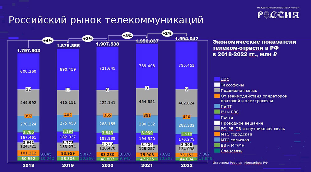 Одним из основных драйверов развития телекома генеральный директор TelecomDaily Денис Кусков назвал документальную электросвязь (ДЭС. Этот вид связи обеспечивает передачу сообщений, представленных в виде документов). По оценкам Росстата, объем рынка ДЭС вырос с 600,26 млрд руб. в 2018 г. до 795,453 млрд руб. в 2022-м.