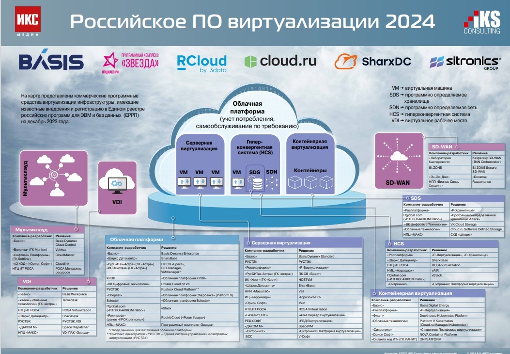 Поиск и выбор действительно работающих, а не просто анонсированных маркетологами продуктов упрощает выпускаемая с 2023 г. «ИКС-Медиа» карта «Российское ПО виртуализации», обновленная версия которой вышла в марте нынешнего года.