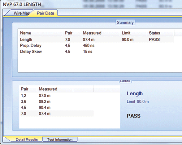 Электрическая длина не всегда совпадает с физической. Расхождение есть хотя бы потому, что шаг повива у каждой пары в кабеле свой. Электромагнитная волна в туго сплетенной паре распространяется медленнее, чем в паре со слабым повивом. Для каждого четырехпарного кабеля тестеры выводят четыре значения электрической длины, и расхождение между парами при предельно допустимой длине постоянной линии 90 м может составлять несколько метров. Длиной кабеля считается наименьшее значение из четырех, но даже оно совпадает с физической длиной не всегда. Это легко проиллюстрировать на конкретном примере.