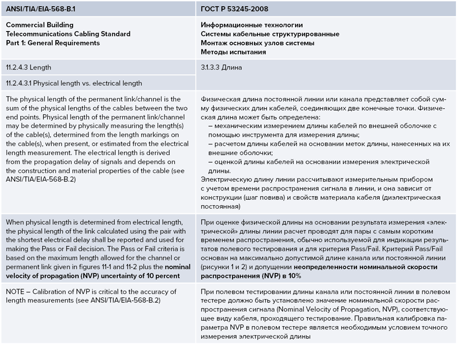 Стандарт ANSI/TIA/EIA-568-B.1, действовавший в начале 2000-х гг., предусматривал допуск ±10% для величины NVP, задаваемой производителями кабеля. Версия B стандартов давно вышла из употребления – ее последовательно сменили версии C, D и даже E различных стандартов TIA. Что интересно, в них допуск ±10% уже не упоминается. Чтобы на него выйти, нужно отслеживать нормативные документы в обратном хронологическом порядке вплоть до версии B. И даже в стандарте TIA-1152 [А], задающем требования к полевым тестерам и измерениям в СКС на основе витой пары (Requirements for Field Test Instruments and Measurements for Balanced Twisted-Pair Cabling), ни в 2009 г., ни в 2016 г. этот допуск не упоминался. Приводятся только ссылки на стандарты, которые сами ссылаются на предшествующие стандарты, и т.д. Этот бюрократический казус неоднократно обсуждался на отечественных и зарубежных форумах и площадках. Однако среди технических специалистов допуск ±10% для NVP считается настолько общим местом, что отсутствие его упоминания в тексте современных стандартов никого не смущает. Более того, этот допуск в явном виде указан в нашем ГОСТ Р 53245-2008, а его на территории России никто не отменял. В тексте четко прослеживается происхождение от стандарта ANSI/TIA/EIA-568-B.1 (безотносительно качества перевода с английского языка) – достаточно просто сопоставить фрагменты с соответствующими пунктами нашего ГОСТ Р (табл. 3).