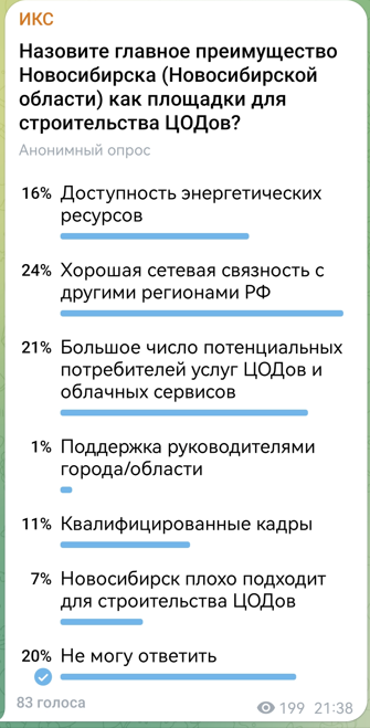 Эксперты высоко оценивают перспективы развития ЦОДов в Новосибирске. Как показал опрос, проведенный в Telegram-канале «ИКС-Медиа», в числе основных преимуществ региона – хорошая сетевая связность с другими регионами РФ, большое число потенциальных потребителей услуг ЦОДов и облачных сервисов и, наконец, доступность энергетических ресурсов (рис. 2). Короче говоря, три главных составляющих успеха – электричество, связь и клиенты – в Новосибирске есть.