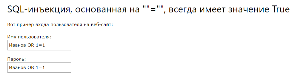 Если на веб-сайте используется неограниченная дополнительными условиями форма для получения имени пользователя и пароля, то простейший вариант атаки — введение нарушителем при входе в систему на веб-сайте в форме любого имени пользователя, например, «Иванов» и всегда справедливого утверждения «1 = 1»: «Иванов OR 1 = 1». Аналогично в поле «пароль»: «Иванов OR 1 = 1». При отсутствии дополнительных ограничений нарушитель окажется в системе, так как условие проверки выполняется.