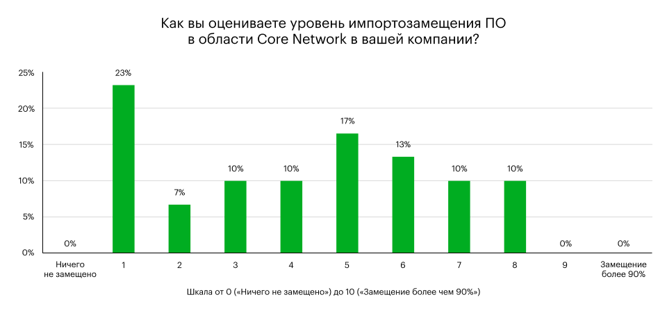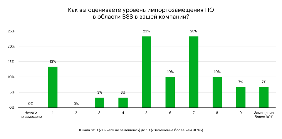 Респонденты отметили довольно высокий уровень импортозамещения биллинговых систем в их компаниях: по 23% участников исследования оценили его на 5 и 7 баллов по шкале от 0 («ничего не замещено») до 10 («замещение более чем 90%»). Также 7% опрошенных, которые включали и операторов из большой четверки, оценили уровень импортозамещения на 10 баллов.