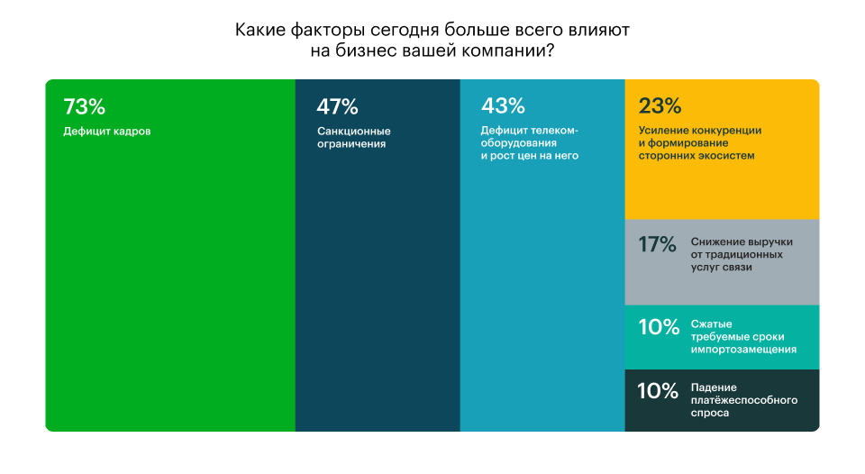 С точки зрения вызовов отрасли, 73% респондентов назвали дефицит кадров самым важным негативным фактором, оказывающим влияние на их бизнес. Такое мнение неудивительно: нехватка высококвалифицированных специалистов, особенно в сфере ИТ и кибербезопасности, — одна из ключевых проблем операторов связи в последние несколько лет. Для ее решения компании используют различные стратегии, включая значительное увеличение зарплат и автоматизацию разработки софта, аналитики данных и тестирования с помощью искусственного интеллекта (ИИ). Санкционные ограничения (47%) и, как следствие, дефицит телеком-оборудования и рост цен на него (43%) — следующие по значимости проблемы, обозначенные респондентами.
