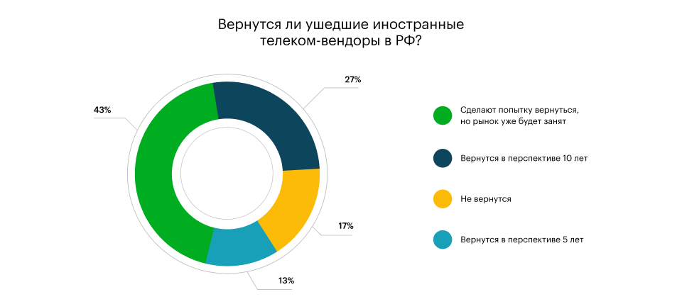 Исследование Nexign также показало, что операторы не верят в возвращение иностранных телеком-вендоров. 43% респондентов считают, что ушедшие компании сделают попытку вернуться, но рынок уже будет занят альтернативными отечественными решениями. С учетом темпов роста рынка отечественного ПО и оборудования для телеком-отрасли, а также требований регулятора к импортозамещению, такой ответ не удивителен.