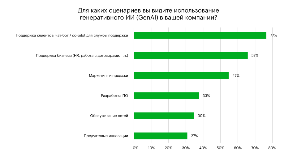Ожидаемо, что наиболее перспективными сценариями применения генеративного ИИ в телеком-бизнесе большинство респондентов (77%) считают кейсы для поддержки клиентов в формате чат-ботов и ИИ-помощников copilots. Также операторы планируют использовать генеративный ИИ для решения задач, связанных с операционной поддержкой бизнеса — например, для автоматизации HR-функций и работы с договорами.