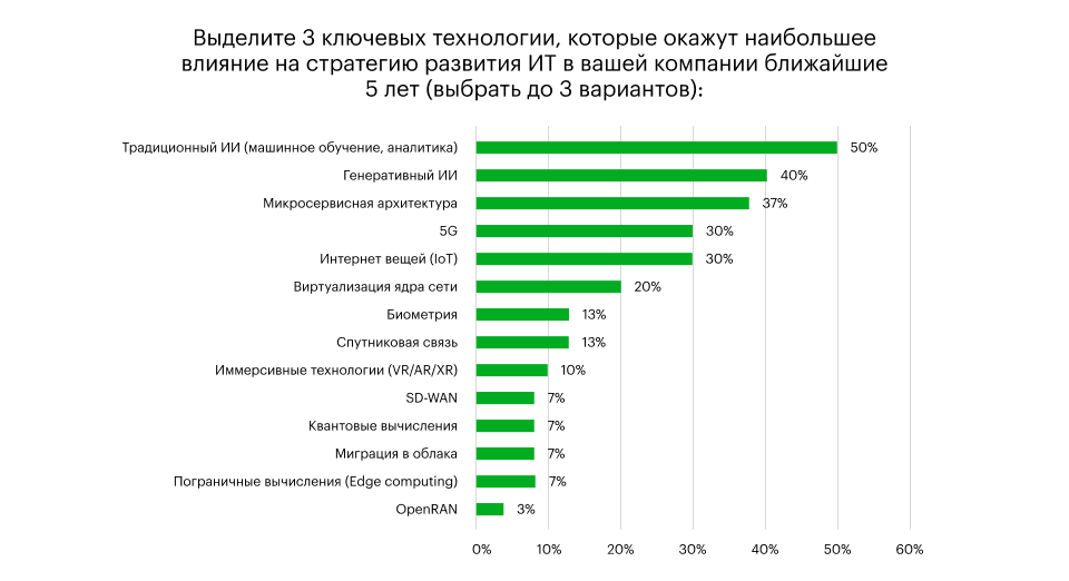 Среди топ-3 ключевых технологий, которые окажут наибольшее влияние на ИТ-стратегию их компаний в ближайшие 5 лет, операторы выделили традиционный ИИ, включая машинное обучение и предиктивную аналитику (50%), генеративный ИИ (40%) и микросервисную архитектуру (37%). Интересно, что технологии OpenRAN, активно продвигаемые ведущими вендорами телеком-оборудования на международном рынке, вызывают у российских операторов наименьший интерес — только 3% опрошенных выбрали этот пункт.