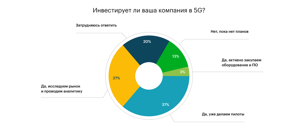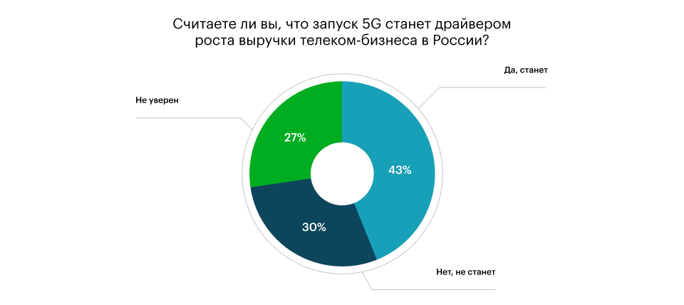 5G — одна из главных технологий телеком-индустрии, но она не вошла в топ-3 драйверов российского рынка в ближайшие 5 лет. Кроме того, мнения операторов о перспективах развития 5G в России разделились. Большинство опрошенных (43%) верит, что запуск 5G поможет сформировать новые источники прибыли, но 30% респондентов сомневаются в том, что пятое поколение связи станет существенным драйвером новой выручки.