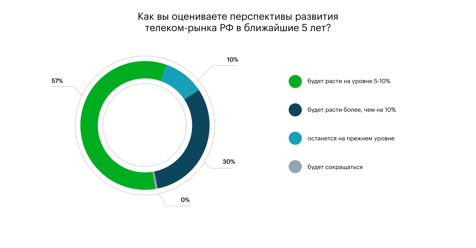 По результатам опроса операторы оптимистично настроены относительно будущего телеком-отрасли в России. Большинство респондентов (57%) прогнозируют ежегодный рост рынка на 5-10%, а 30% ожидают более чем 30% рост в ближайшие пять лет.