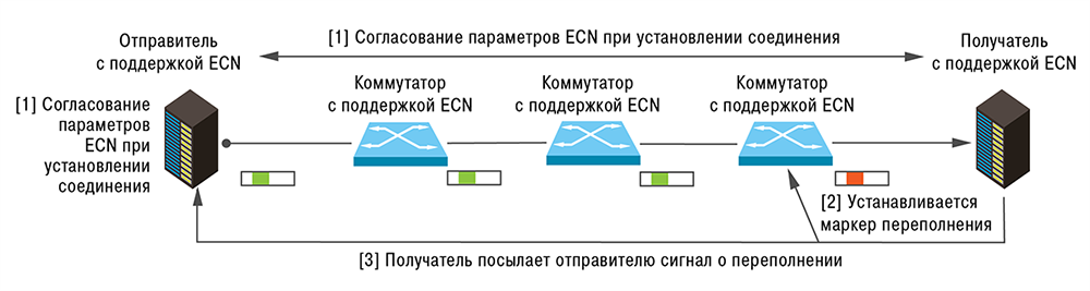 И здесь предлагаются разные методы, ни один из которых не решает проблему полностью. Самый простой – использование больших буферов памяти на коммутаторах или сетевых картах. Но при современных скоростях этого недостаточно, поскольку буферы быстро переполняются поступающими пакетами. Другой метод состоит в том, чтобы при переполнении канала на хост источника или вышестоящий коммутатор посылать сигнал «пауза» или снижать скорость передачи пакетов. Делать это можно, например, при помощи механизма ECN (рис. 2), позволяющего сетевым устройствам уведомлять отправителей о перегрузках в сети.
