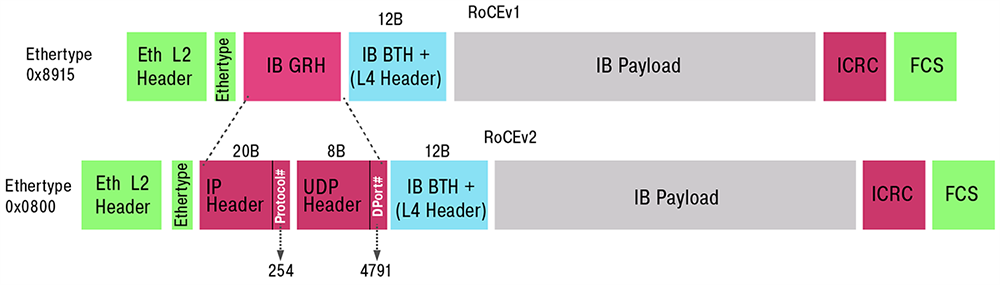 Первая версия (RoCE v1) работала на канальном (L2) уровне, осуществляя связь между любыми двумя хостами в одном и том же широковещательном домене Ethernet. Вторая версия протокола (RoCE v2) обеспечивает маршрутизацию пакетов и их передачу без потерь. Она улучшена включением в заголовок поля UDP/IP (рис. 1), поддерживает возможность работы в L3 сетях и сигнал явного уведомления о перегрузке (Explicit Congestion Notification, ECN).